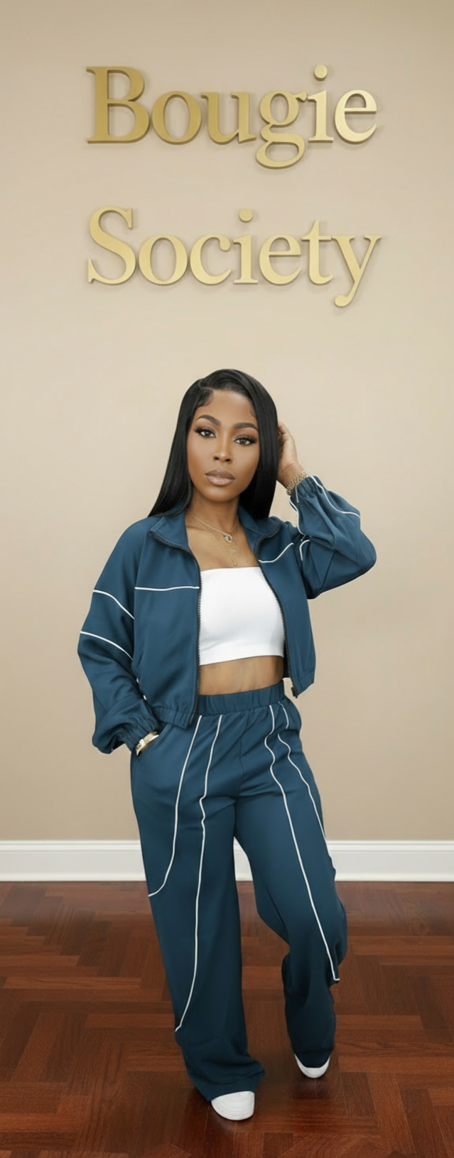 Techno Crepe Front Zip Up Pipping Stripes Detail Side Pockets Waist Elastic Trim Long Sleeve Cropped Jacket Top And Elastic Waistband Contrast Pipping Stripes Detail Side Pockets Flare Pants Set